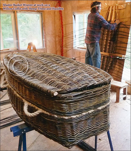 Glen, a local artisan willow basket weaver, has become very interested in making willow caskets and coffins. He grows and processes his own willows, which are completely free of any chemicals or fertilizers. He makes everything by hand right here on our island in BC, Canada. The willow coffin is naturally resilient and strong, and our organic hemp ropes are used for trims and handles. He makes them to order in different sizes. At present the eco willow - hemp coffins are not offered for purchase to be freighted, as local demand is more than enough for this single-artisan workshop. At the time of this writing, the willow - hemp coffins cost between $1,200 - $1,600, depending on the size. They are works of art, multi-colored (or uni-colored as per preference — he grows different types of willows ranging in color from deep red to bright yellow to muted browns and greens) and many people actually use them as standing chests or storage chests. For an additional fee, the completely biodegradable willow-hemp caskets and coffins can be lined with organic cotton fabric as well.