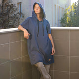 Super soft and breathable 100% organic cotton knit hoodie tunic, with two side pockets. 100% biodegradable: super soft 100% organic cotton knit, organic cotton thread, natural European cork & organic cotton labels. Biodegradable fiber-reactive dye indigo. Featuring wrist-deep in-seam pockets. Great as an everyday organic cotton tunic dress, lounge dress...