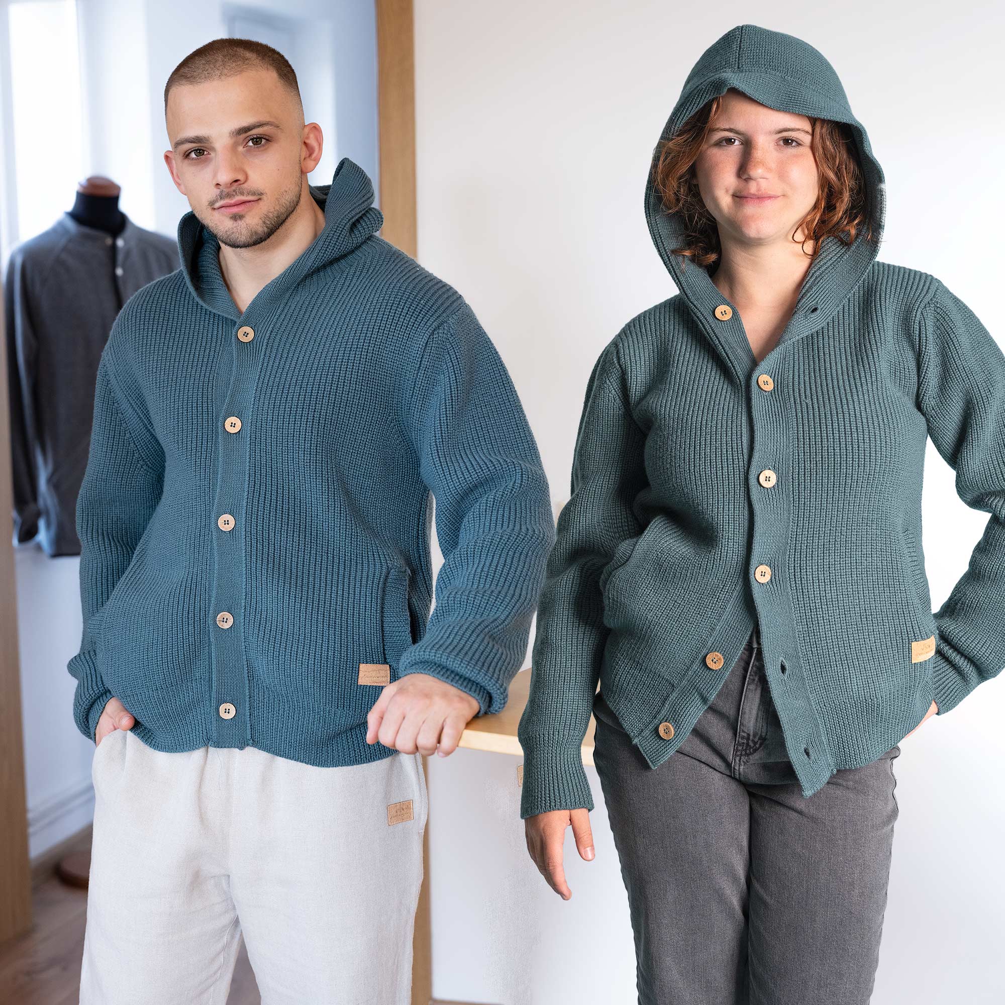 Style: 100% organic merino wool hooded buttoned cardigan sweater, for men & women