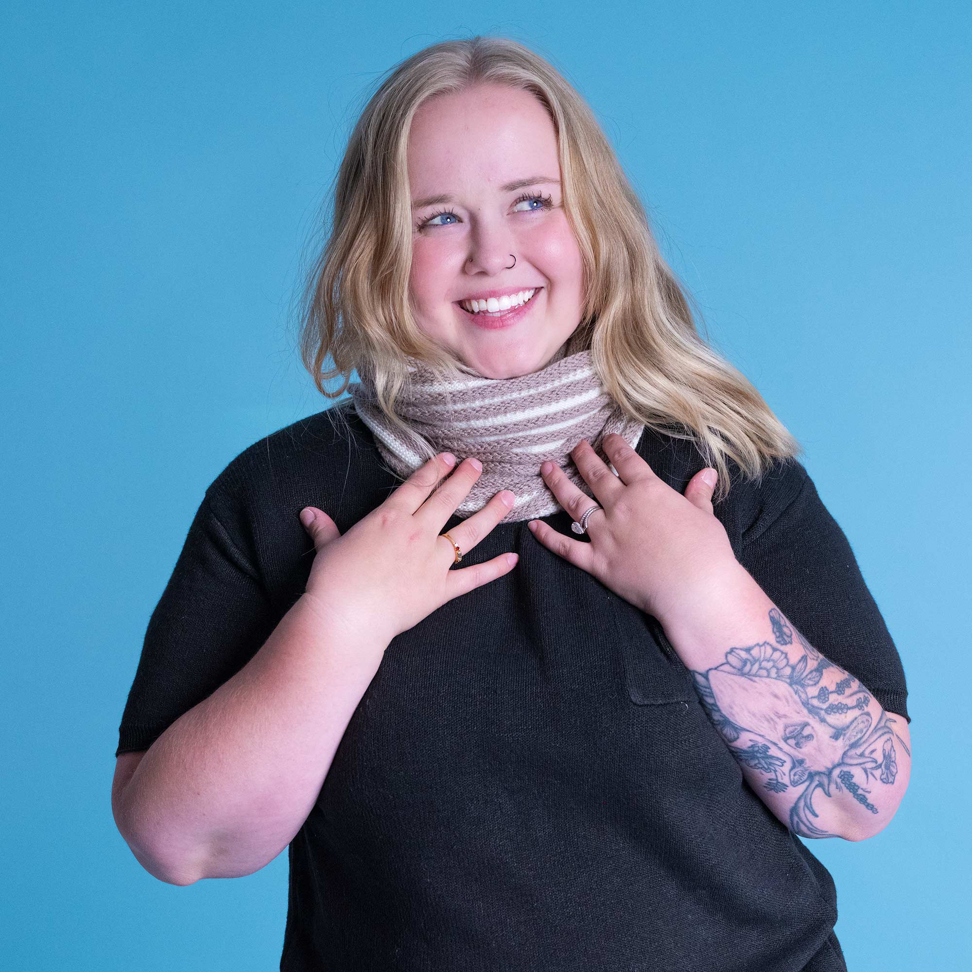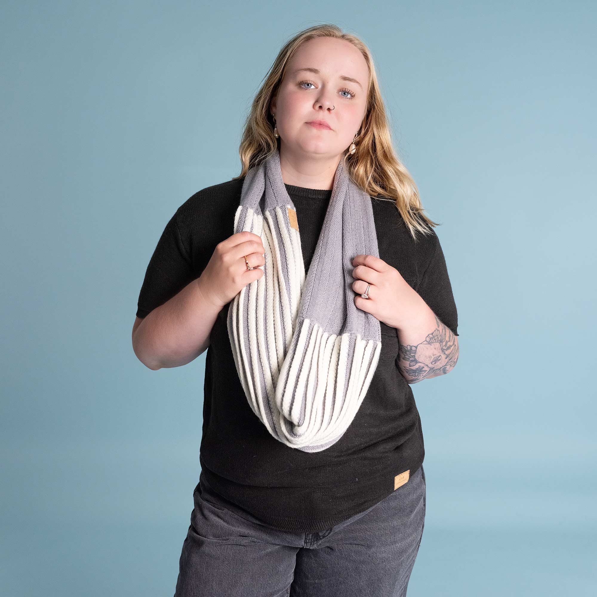 100% organic merino wool infinity scarf knitted in a unique pop-out ribbed pattern that maximizes coziness and warmth. Matching knit to pair with Fallswater 100% organic merino beanie hat. Both organic merino scarf and hat are 100% biodegradable: no elastic, no latex, no polyester, no polyamide, no acrylic, no synthetics. Please read before buying: Do not put this special scarf in the dryer. If you must use a dryer, please choose one of our organic cotton options instead. Merino will shrink in the high dry heat of the dryer. Shrinkage is not a claimable defect (we do not use forever chemicals to shrinkage-proof our products). By purchasing this unique merino scarf, you agree to not use the dryer. Wash on gentle cycle in a laundry mesh bag with lukewarm water and mild biodegradable detergent and lay flat to dry. Steam iron at wool setting, if desired. Wash as infrequently as possible. Organic merino wool is naturally anti-bacterial and anti-odor. Or have it professionally cleaned at one of the eco-minded cleaners. | The purest organic merino wool scarf ever - super soft and warm. Chemical-free. We source our 100% certified organic merino wool from the purest yarns in Italy and France. Our organic merino wool scarves are made one by one at Rawganique Atelier in Europe for true purity.
