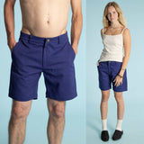 As perfect as pure 100% organic cotton shorts can be: our elastic-free, elastane-free 100% organic cotton shorts are made from organic cotton twill fabric that allows for structure while being breathable. Organic cotton shorts, cut in the classic chino style. Please note: Slide-over button; not a pop-out button! Slide the button to the right to open and slide to the left to close/lock in place. Watch VDO in Image Gallery for visual reference. Our customers' absolute favorite 100% organic cotton shorts. 7" inseam. Unisex 30" - 36" waists. Natural (undyed, bleach-free), Indigo or Earth Brown. 2 side pockets, 2 inset back pockets. Slide-out buttons. Watch video in Image Gallery to learn more. Male model is 5'8"/30" waist wears size 30". Female model is 5'9"/29" waist and wears size 30". Male model with blue T-shirt is 6'/36" waist and wears size 36".