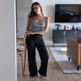Comfortable, cozy, pure 100% organic linen knit pants with boho flowy styling: 100% biodegradable: organic cotton thread, covered organic elastic drawstring waistband (50% organic cotton, 50% natural rubber). Our exclusive 100% organic linen heritage ribbed knit makes these cozy women's organic linen knit pants flowy, stretchy and hugging but not confining like polyester leggings. Flared look. No polyester or elastane in the knit, which is made of 100% organic flax linen jersey.  Please read before buying: Do not put these special pants in the dryer. If you must use a dryer, please choose one of our organic cotton options instead. Untreated natural linen will shrink in the high dry heat of the dryer. Shrinkage is not a claimable defect (we do not use forever chemicals to shrinkage-proof our products). By purchasing these unique organic linen pants, you agree to not use the dryer. Wash on gentle cycle with like colors in a laundry mesh bag (or by hand) with lukewarm water and mild biodegradable detergent and lay flat to dry. Do not use bleach and do not use fabric softeners. Steam iron at linen setting to attain the same original soft and cozy hand, if desired. | Our boho chic organic linen pants for ladies are truly 100% biodegradable for the plastic-free lifestyle. Even the sewing thread is plastic-free 100% cotton! Perfect for everyday wearing, yoga, & lounging around the home. Breathable all-natural organic linen knit pants are best for moisture & temperature control.