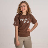 Grown in USA, made in USA 100% organic cotton T-shirt, printed using non-toxic water-based eco ink with 'Perfect As Is'. See sizing chart in Image Gallery. S and M run small.