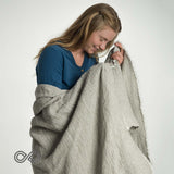 These special HANDWOVEN 100% organic French linen towels are woven to be 3 times the size they end up being. We wash the original handwoven organic linen waffle towel to shrink it down to ⅓ of the original size, resulting in a thick, soft, cozy, and absorbent all-purpose towel and shawl. We found out through a research trip in France that this was the secret of how some vintage heritage organic linen towels were so prized the world over - the volume and coziness that you achieve via this method of handmaking heritage organic linen towels are legendary.This magnificent 100% organic French linen waffle towel is part of our Limited Edition Bespoke Line - unique one-of-a-kind pieces of organic fiber arts that truly showcase the beauty of organic French flax linen. Truly something for the linen connoisseur to treasure and pass on. A lot of pure organic French flax linen long-strand fibers go into this hefty organic linen towel. Great for travel and boating too as our organic linen towel is very quick to dry and easy to pack. These special organic linen towels also excel as linen friction towels and sauna towels, thanks to their exfoliating qualities.