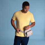 This limited-edition organic stiff canvas waist pack is an indispensable companion to keep your sundry valuables safe & organized day-to-day or during a trip: with a choice of organic hemp and flax linen, the waist pouch fanny pack can also be used a cross-body hemp / linen bag. 100% organic 21oz stiff hemp or 18oz flax linen canvas waist pack, featuring YKK zippers (made from recycled components), metal clasp & natural European cork label. Strap made of 1.25” organic canvas webbing and plastic clasp. Metal D-rings in both the front zippered pocket and inside main compartment. Available in dye-free natural and organic biodegradable eco dye black.