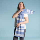 Thick and cozy oversized 100% organic merino wool scarf for men and women in our new Arctic Charcoal/Snow & Snow/Wave Blue heritage knit quilt stripe pattern. The purest wool scarf - super soft, cozy & warm. We source our certified organic merino wool from Italy and France and make the 3-ply pure wool scarf piece by piece at our Atelier in Europe for true purity. No acrylic, no polyamide, no polyester, no synthetic yarns. Chemical-free. 70”x12”.