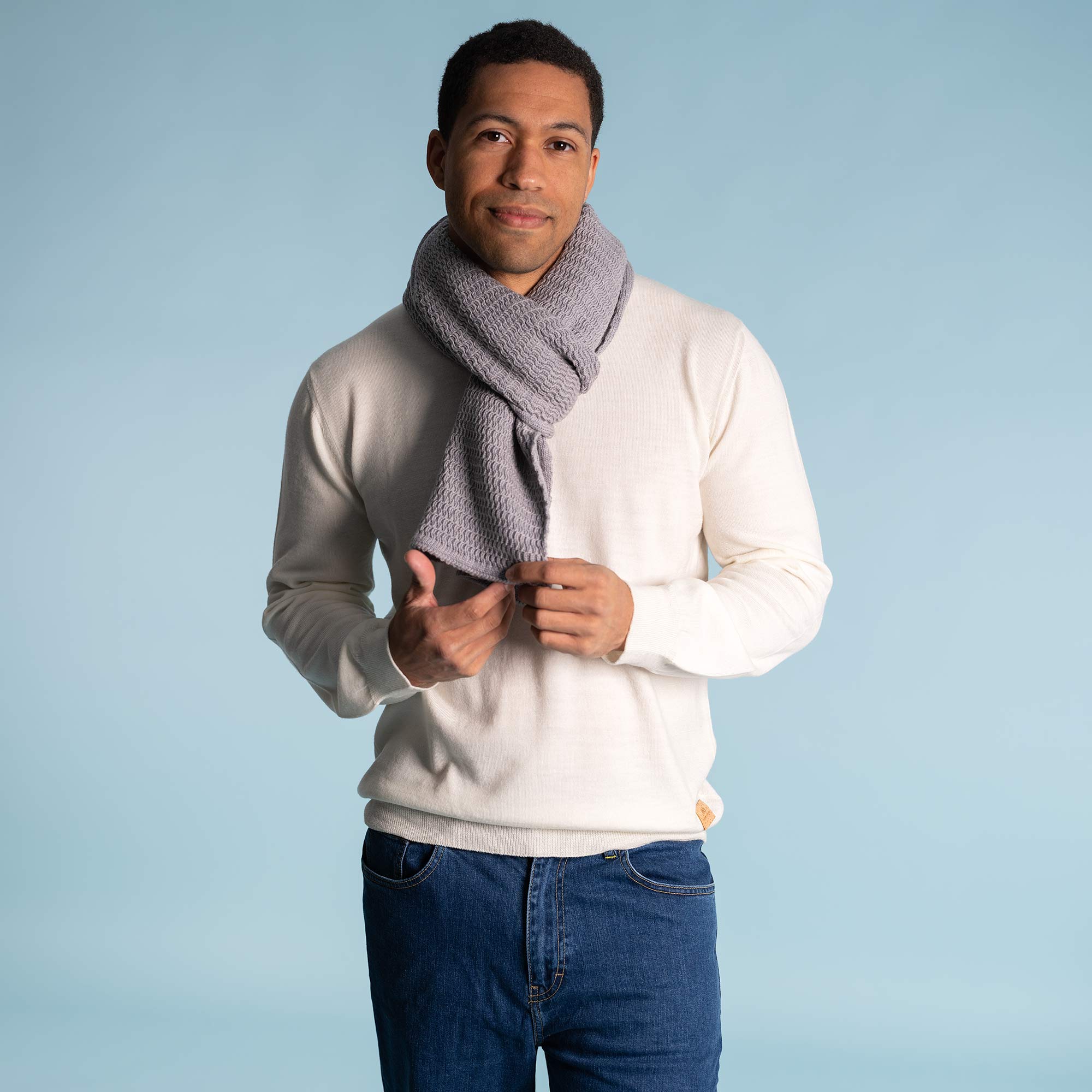 100% organic merino wool scarf in a luxuriously textured pattern that maximizes warmth. 100% biodegradable: no plastic, no polyester, no polyamide, no acrylic, no elastic, no latex, no synthetics. Thick & cozy oversized 100% certified organic merino wool scarf for men and women in Deep Blue, Snow (unbleached, dye-free), Red & Shadow Gray. The purest organic merino wool scarf - super soft, cozy & warm. We source our certified organic merino wool from Italy and France and make the 3-ply pure wool scarf piece by piece at our Atelier in Europe for true purity. 70”x12”.
